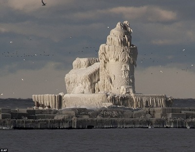 水しぶきで凍りついた灯台 アメリカ